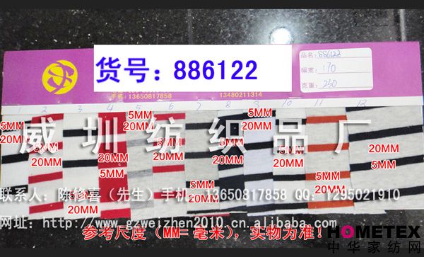 織物組織:色織 幅寬:170 密度:240T 貨號(hào):886122 具體用途:襯衫、休閑服、棉服、褲裝、內(nèi)衣、睡衣、時(shí)裝 別名:886122 成分及含量:滌棉 主要用途:服裝用布 紗支:32 ============================================================= 以上產(chǎn)品全部現(xiàn)貨供應(yīng),可隨時(shí)提供樣布卡和現(xiàn)貨,隨時(shí)發(fā)貨。所有產(chǎn)品全部是廠家直銷價(jià),我們承諾:以超低利潤(rùn)營(yíng)銷,我們只求銷售量。為保證您的利益,我司建議您在采購(gòu)前先確認(rèn)我們的品質(zhì)樣與顏色樣后再拿大貨,期待與您的真誠(chéng)合作。因產(chǎn)品種類較多,具體參考未盡詳盡,如有需要,請(qǐng)您與我們聯(lián)系。 瑞豐紡織(中大旗艦店)坐落于國(guó)內(nèi)最大的紡織面料產(chǎn)業(yè)中心—廣州中大,是一家專業(yè)銷售面料的廠家直銷商。主要經(jīng)營(yíng)產(chǎn)品有:全棉凈色、仿記憶絲面料、全棉(TC)色織等,面料品種花達(dá)上千余種,所有產(chǎn)品全部現(xiàn)貨經(jīng)營(yíng)。 我們面料的品質(zhì)來源于:1、采用國(guó)內(nèi)外優(yōu)質(zhì)的原材料;2、使用精良的生產(chǎn)工藝和設(shè)備;3、完善的生產(chǎn)質(zhì)量管理體系。我們具有開發(fā)和創(chuàng)新品種的強(qiáng)烈意識(shí)和優(yōu)越條件,并根據(jù)客戶需求與市場(chǎng)變化時(shí)時(shí)推出潮流面料。憑著多年的專業(yè)行業(yè)經(jīng)驗(yàn),根據(jù)客戶需求,不論客戶在全國(guó)任何地方,只要提供小樣,就可在一兩天時(shí)間內(nèi)輕松獲得所需面料的信息。 批發(fā)說明供應(yīng)商支持混批 。 ============================================================= 有意請(qǐng)加QQ:1295021910或電話聯(lián)系。 公司名稱:威圳紡織品廠 聯(lián)系人:陳修喜先生 手機(jī):13650817858 網(wǎng)址:http://www.gzweizhen2010.cn.alibaba.com =============================================================