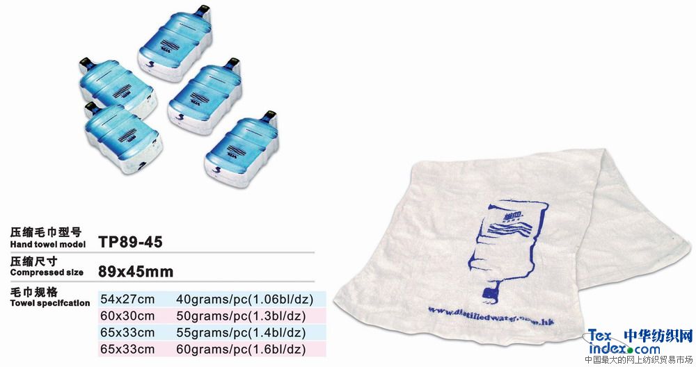 高級環保壓縮毛巾是二十一世紀的高科技成果、采用100%純棉經高溫壓處理而成的新一代產品。放入水中浸片刻即可張開使用。本產品新奇獨特,干凈衛生,產品企業形象宣傳極具效力。廣泛用于廣告宣傳界、酒店、旅游公司等。