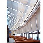 ◆電動折疊式天棚簾是一種由左右兩側導軌提供動力,面料中有橫向連接桿的天棚簾遮陽系統,也可以制成弧型,設計運用得當可以和建筑線條相吻合,即遮陽實用又可保持建筑
