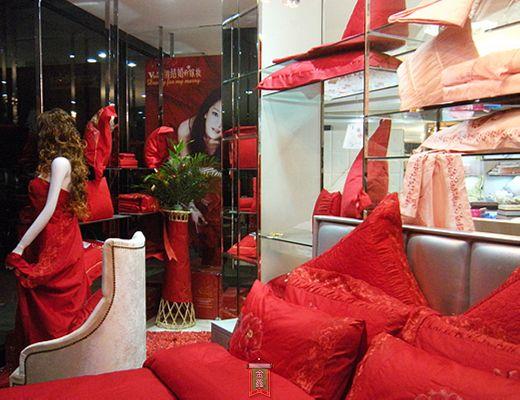 走進(jìn)紫羅蘭家紡汨羅專賣店,一股典雅高貴的簡(jiǎn)約之風(fēng)迎面撲來(lái)。進(jìn)門左手邊,正對(duì)視覺的是一套喜結(jié)良緣床蓋六件套,它運(yùn)用了中國(guó)傳統(tǒng)的服裝元素,大紅的唐裝布,華貴的金色飾邊,嬌艷飽滿,立體感強(qiáng);枕面和被面上極富中國(guó)韻味的牡丹圖案,給人營(yíng)造出強(qiáng)烈的視覺感。