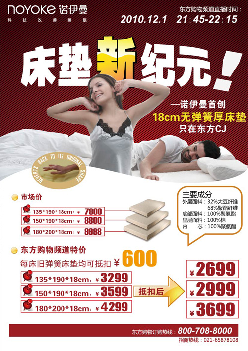 2010-12-1活動內容:史無前例!諾伊曼豪華超厚記憶床墊4折起,另外,每床舊彈簧床墊均可抵扣600元!!!諾伊曼為你送上冬日里的無限溫暖!超值特惠,只在東方CJ,僅限一小時!還等什么,快快搶購吧!產品明細:品名尺寸現價原價抵扣價諾伊曼豪華零壓力床墊135*190*18CM329978002699150*190*1...[繼續閱讀]
