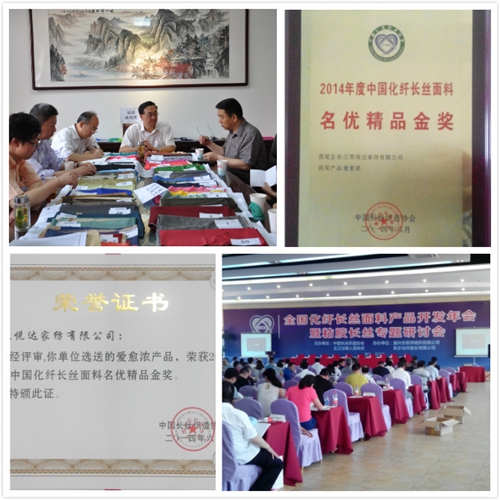 2014-6-23近日,在全國化纖長絲面料產(chǎn)品開發(fā)年會上,悅達(dá)家紡選送的“愛愈濃”新產(chǎn)品,榮獲2014年度中國化纖長絲面料名優(yōu)精品金獎。此次會議共授予仿真類、運動休閑類、新型功能類、家紡類、防寒服類等7個類別名優(yōu)精品金獎67個、名優(yōu)精品獎108個、入圍獎42個。悅達(dá)家紡新產(chǎn)品位列全國7個家紡類名優(yōu)精品金獎產(chǎn)品第三位,...[繼續(xù)閱讀] -