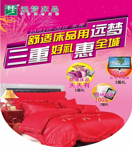 2012-10-10金秋十月,國(guó)慶佳節(jié)。遠(yuǎn)夢(mèng)家居與民同慶,回饋消費(fèi)者,特推出“三重好禮惠全程”感恩促銷活動(dòng)。活動(dòng)時(shí)間:2012年10月1日至2012年10月31日,活動(dòng)區(qū)域:東莞全城中遠(yuǎn)夢(mèng)賣場(chǎng)及遠(yuǎn)夢(mèng)專賣店。本次活動(dòng)細(xì)則:活動(dòng)一重:勁爆床品天天有賀中秋,慶國(guó)慶,遠(yuǎn)夢(mèng)品牌勁爆勢(shì)在必行;顒(dòng)期間,天天推出爆款產(chǎn)品,詳見海報(bào)。...[繼續(xù)閱讀] -