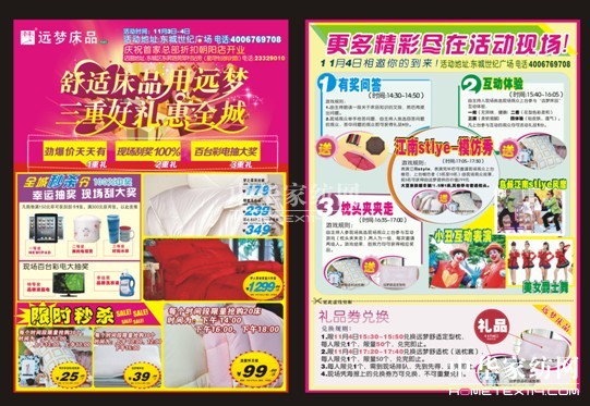 2012-11-911月3-4日,遠(yuǎn)夢(mèng)家紡?fù)瞥隽恕笆孢m床品用遠(yuǎn)夢(mèng),三重好禮惠全城”為主題在東莞市東城世紀(jì)廣場(chǎng)外做外展系列活動(dòng)。據(jù)了解,本次活動(dòng)是遠(yuǎn)夢(mèng)家紡今年比較大型活動(dòng);顒(dòng)開展期間,展開了一系列展示活動(dòng),讓更多的市民了解床品知識(shí)和掌握如何購(gòu)買舒適實(shí)惠的床品,以創(chuàng)造舒適良好的家居環(huán)境。活動(dòng)期間,特別邀請(qǐng)東莞最活躍的表...[繼續(xù)閱讀] -